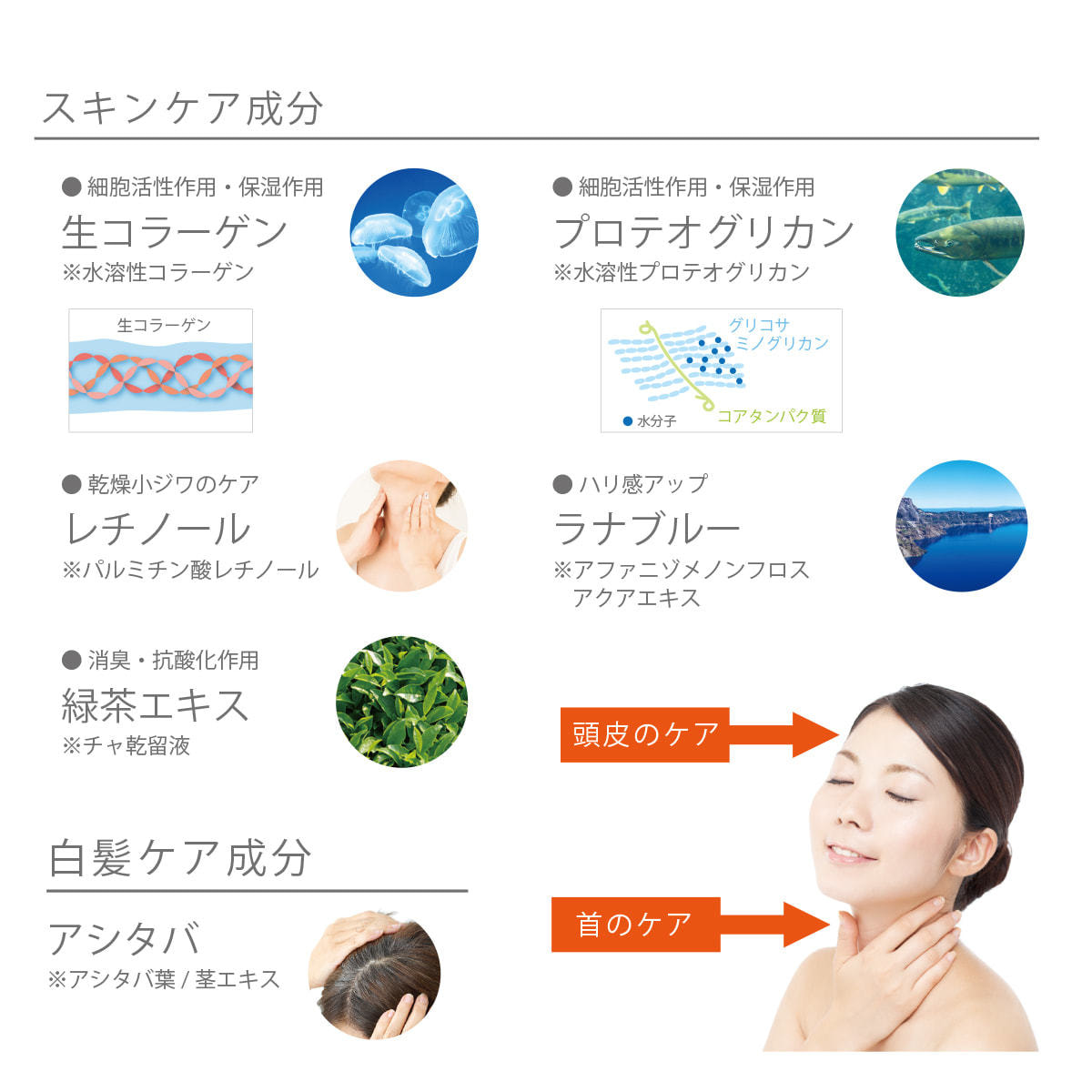 浸透性の高い生コラーゲンを配合することにより、髪と頭皮にうるおいを与え、ハリと弾力のある髪を作ります。