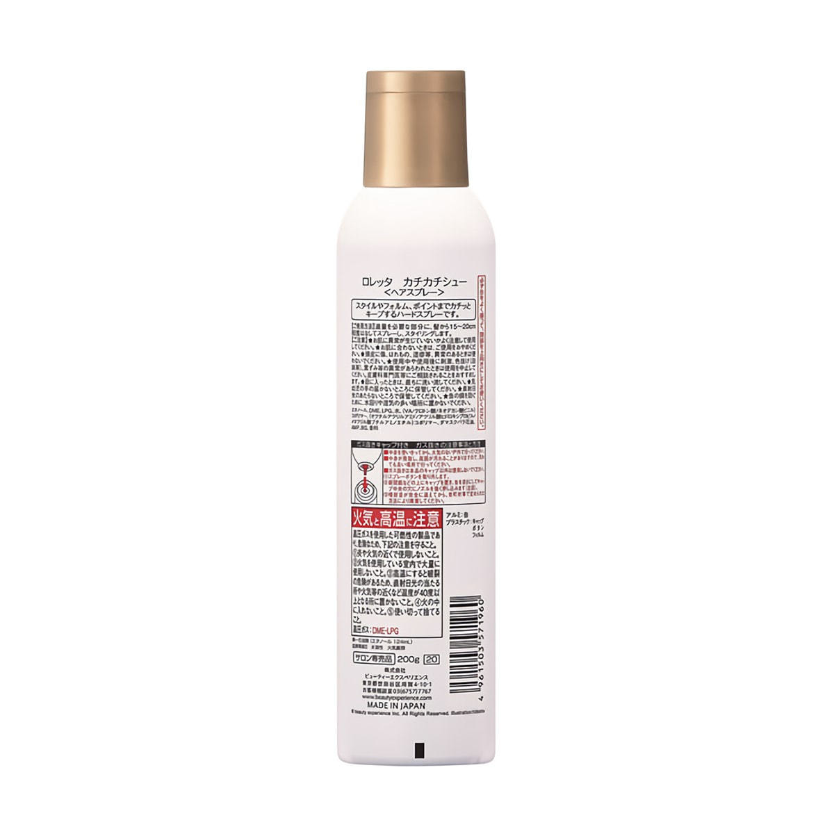 エタノール、DME、LPG、水、(VA/クロトン酸/ネオデカン酸ビニル)コポリマー、(オクチルアクリルアミド/アクリル酸ヒドロキシプロピル/メタクリル酸ブチルアミノエチル)コポリマー、ダマスクバラ花油、AMP、BG、香料