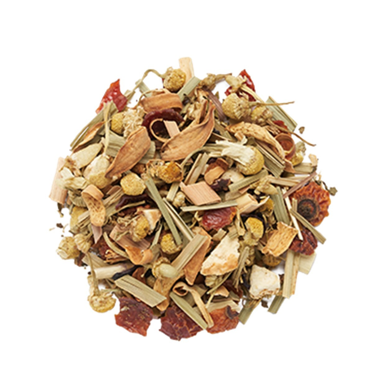 カモミール【クロアチア産】、有機ローズヒップ、レモングラス、オレンジピール、オレンジフラワー、有機スペアミント、有機ハイビスカス、香料