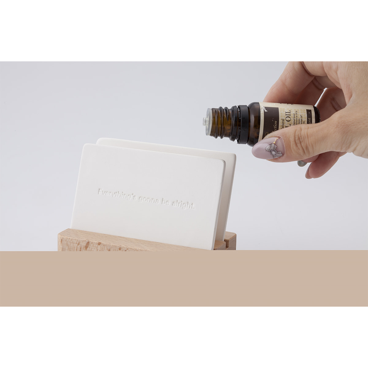 カードディフューザーは、名刺サイズのシンプルなアロマディフューザー。陶器製のプレートに、お気に入りのアロマや香水を染み込ませて使います。電気を使わないため、静かで環境にも優しい香りのプレート。家やオフィスなど、気軽に自分だけの香りを楽しむのにぴったりです。プレートを立てるためのブナの木製スタンドがセットになっています。スタンドを使わずに、セラミックプレートを名刺入れなどに入れて香りを携帯することも可能です。インテリアのアクセントとしても素敵なアロマディフューザーは、ミニマルなアプローチで新しい香りの楽しみ方を提案します。素敵なギフトボックス入りで、大切な方への贈り物にも最適です。