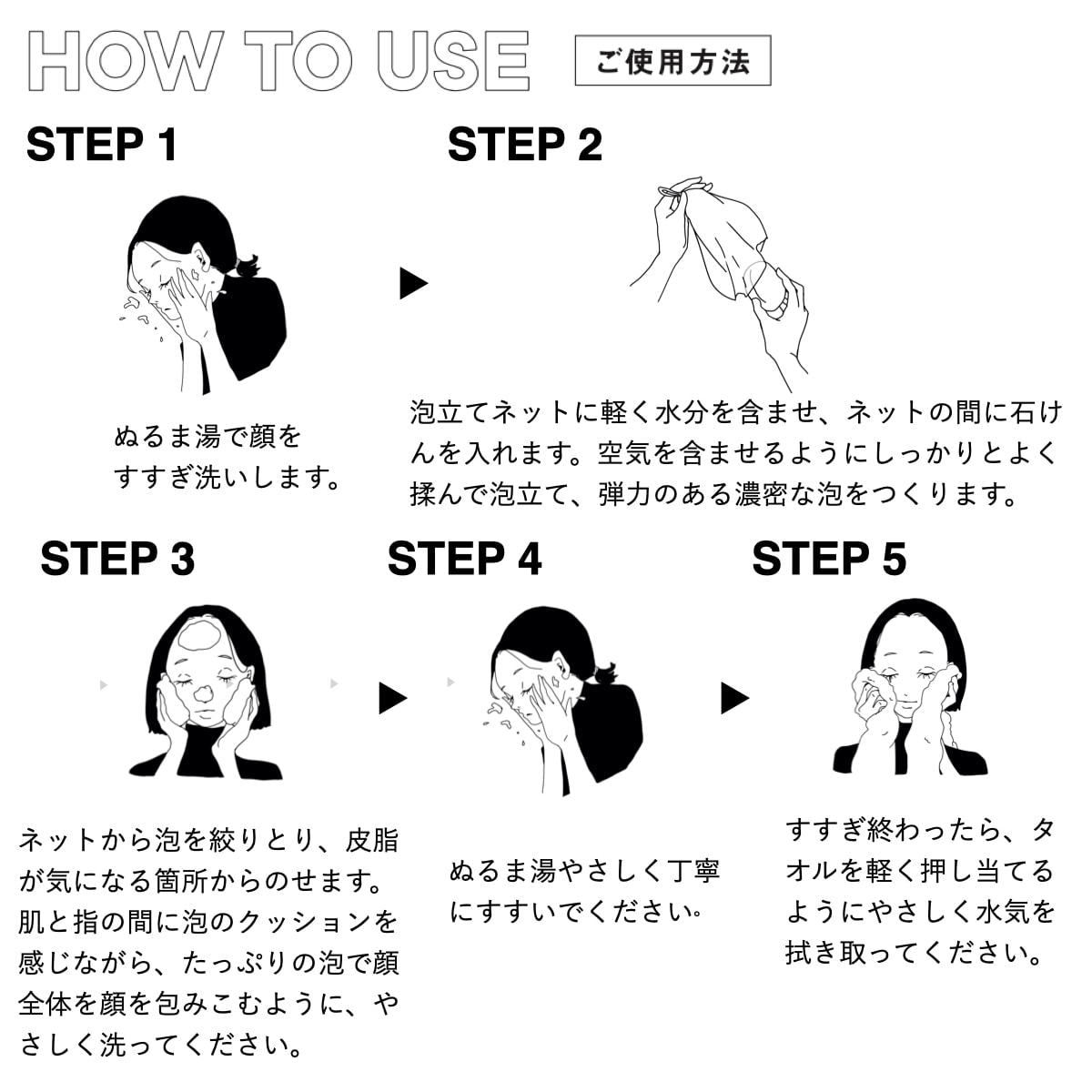 空気を含ませるように泡立て、絞りとった泡で顔を包み込むようにやさしく洗います。洗顔後は十分にすすいでください。