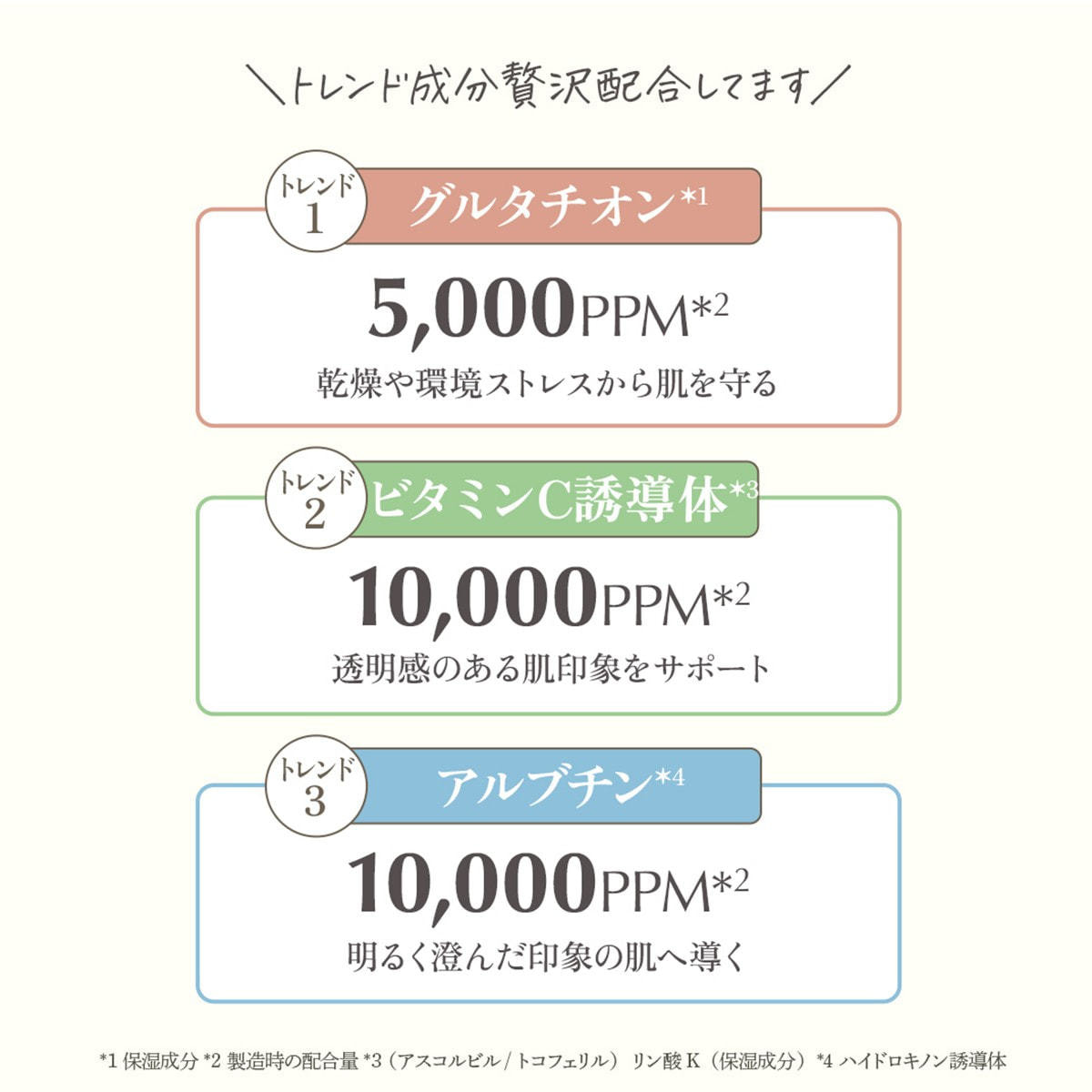 水、BG、ペンチレングリコール、アルブチン、グリセリルアスコルビン酸、(アスコルビル/トコフェリル)リン酸K、グルコシルルチン、リン酸アスコルビルMg、3-O-エチルアスコルビン酸、アスコルビルリン酸Na、ヘキシル3-グリセリルアスコルビン酸、3-ラウリルグリセリルアスコルビン酸、グルタチオン、レチノール、フィトスフィンゴシン、セラミドNP、セラミドNG、セラミドAP、トコフェロール、セレブロシド、トリ(カプリル酸/カプリン酸)グリセリル、水添レシチン、コレステロール、カキタンニン、ポリアクリレートクロスポリマー-6、ベヘニルアルコール、ペンタステアリン酸ポリグリセリル―10、ステアロイルラクチレートNa、1,2-ヘキサンジオール、乳酸Na、グリセリン、水酸化K、クエン酸、クエン酸Na、BHT、カルボマー、フェノキシエタノール